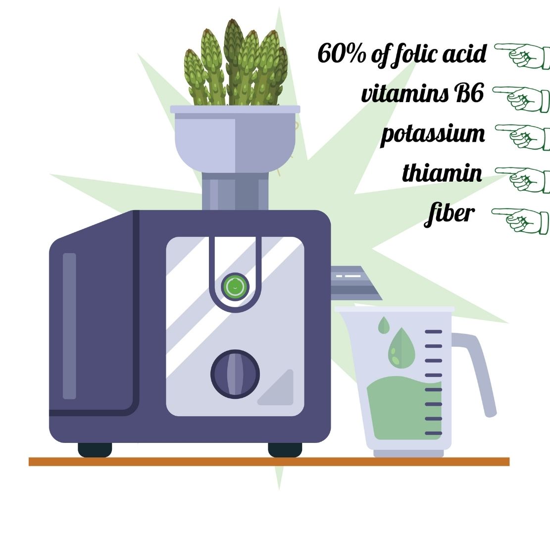 3. ASPARAGUS: If you’re looking for moderately-balanced vegetables nutritionally, asparagus should be right on top of your guess list. Asparagus is high in different nutrients like fiber, thiamin, vitamins B6 and A, as well as folic acid and potassium. If you serve 5-ounce of asparagus, you’ll get about 60% of folic acid in return and the good thing is that this folic acid is low in calories, thereby making it very healthy to consume. To prep you veggie, rinse it thoroughly and put in your juicer, starting from the bottom of the stalk.